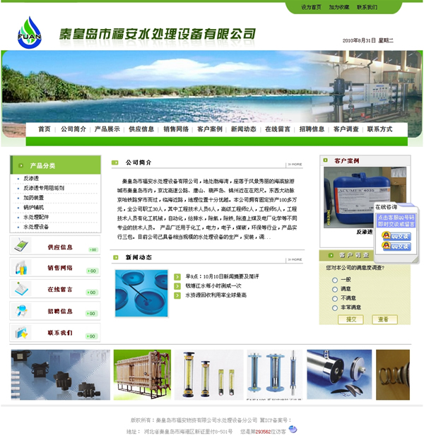秦皇島市福安水處理設備有限公司,地處渤海灣,座落于風景秀麗的海濱旅游城市秦皇島市內,京沈高速公路、唐山、葫蘆島、錦州近在在咫尺。東西大動脈京哈鐵路穿市而過,臨海近路,地理位置十分優越。本公司擁有固定資產100多萬元,全公司職工30人,其中工程技術人員6人,高級工程師2人,工程師5人,工程技術人員有化工機械,自動化,給排水,除氧,除鐵,除渣上煤及電廠化學等不同專業的技術人員。 產品廣泛用于化工,電力,電子,煤碳,環保等行業,產品實行三包。目前公司己具備相當規模的水處理設備的生產,安裝,調試,人員培訓等能力。可為用戶提供可行性研究,技術咨詢,工程設計,設備制造,維修保養,安裝調試,配件供應等服務。并為用戶設計選型,安裝,調試,代培技術人員等提供更優質的服務。