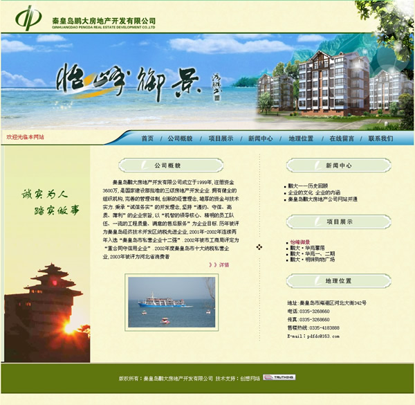 秦皇島鵬大房地產開發有限公司成立于1999年,注冊資金3600萬,是國家建設部批準的三級房地產開發企業。擁有健全的組織機構,完善的管理體制,創新的經營理念,雄厚的資金與技術實力.秉承“誠信務實”的開發理念,堅持“遵約、守信、高質、薄利”的企業宗旨,以“機智的領導核心、精明的員工隊伍、一流的工程質量、滿意的售后服務”為企業目標.歷年被評為秦皇島經濟技術開發區納稅先進企業,2001年-2002年連續兩年入選“秦皇島市私營企業十二強”.2002年被市工商局評定為“重合同守信用企業”.2002年度秦皇島市十大納稅私營企業,2003年被評為河北省消費者
