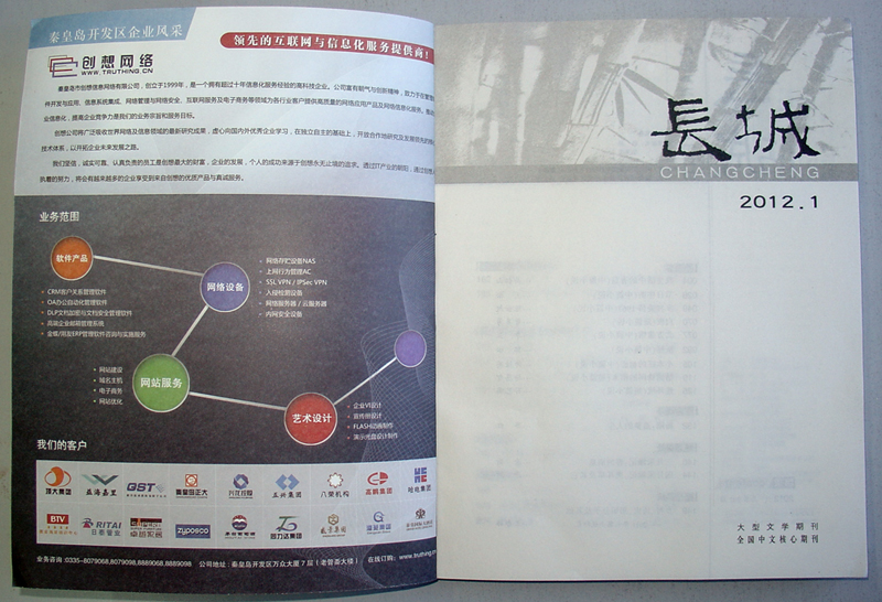 新年伊始,創(chuàng)想網(wǎng)絡(luò)做為秦皇島開發(fā)區(qū)的明星推薦企業(yè),榮登全國中文核心期刊《長(zhǎng)城》的封面!堕L(zhǎng)城》期刊由河北省作家協(xié)會(huì)主辦,是中國中文核心期刊,同時(shí)被美國國家圖書館館藏。